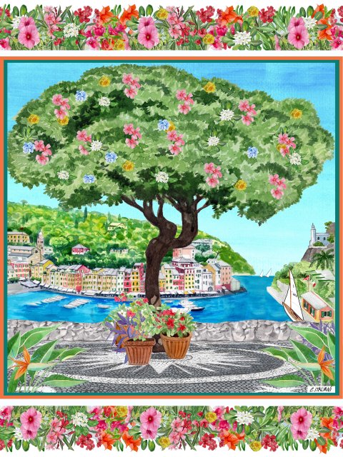 Da questa posizione privilegiata, il tratto si fa analitico per accogliere l’abbraccio del porticciolo e la sede dello Yacht Club, incastonata con eleganza tra le tonalità delle case e il blu profondo della baia. Il risultato è un dialogo curato in ogni minimo dettaglio, dove la precisione scientifica della flora incontra la poesia di uno degli scorci più suggestivi al mondo, catturato nel momento esatto in cui la natura si fa cornice della storia.”