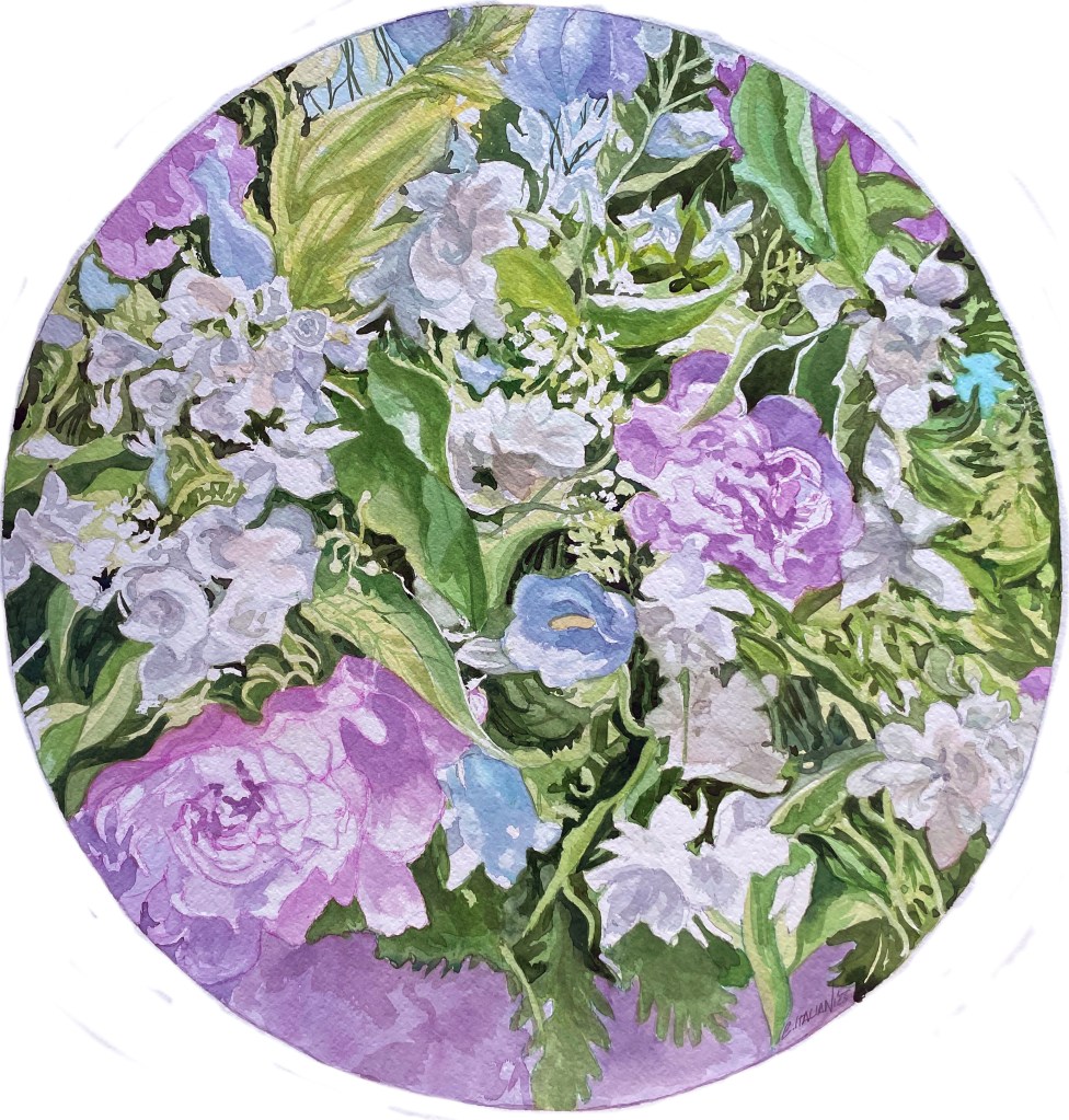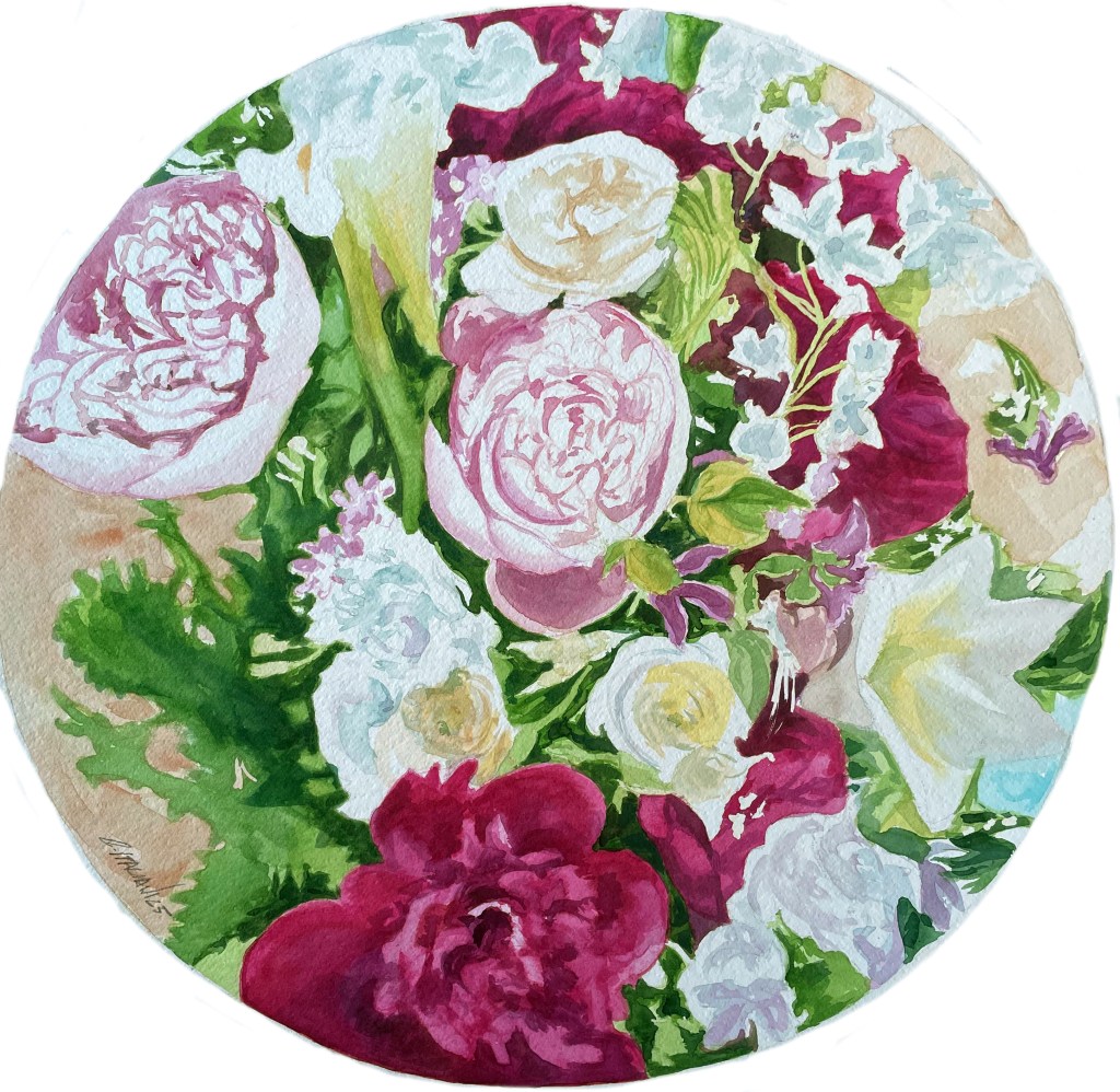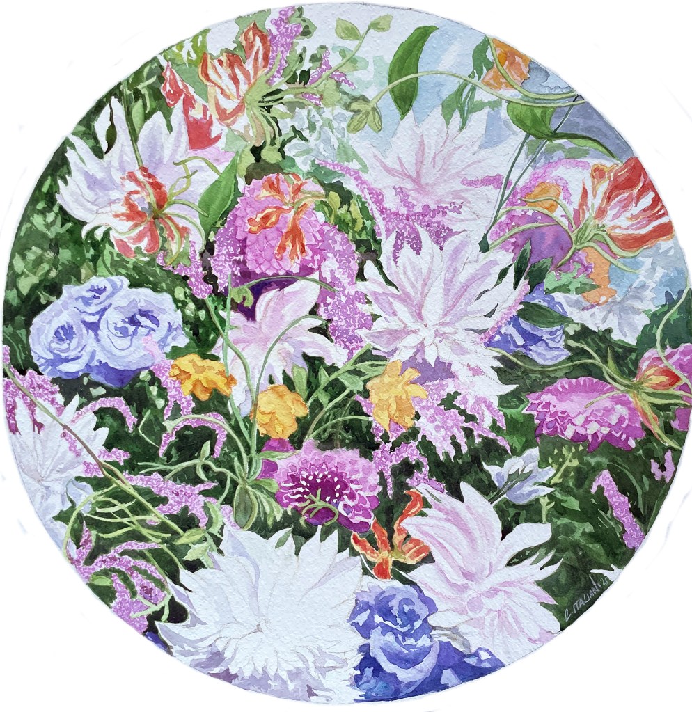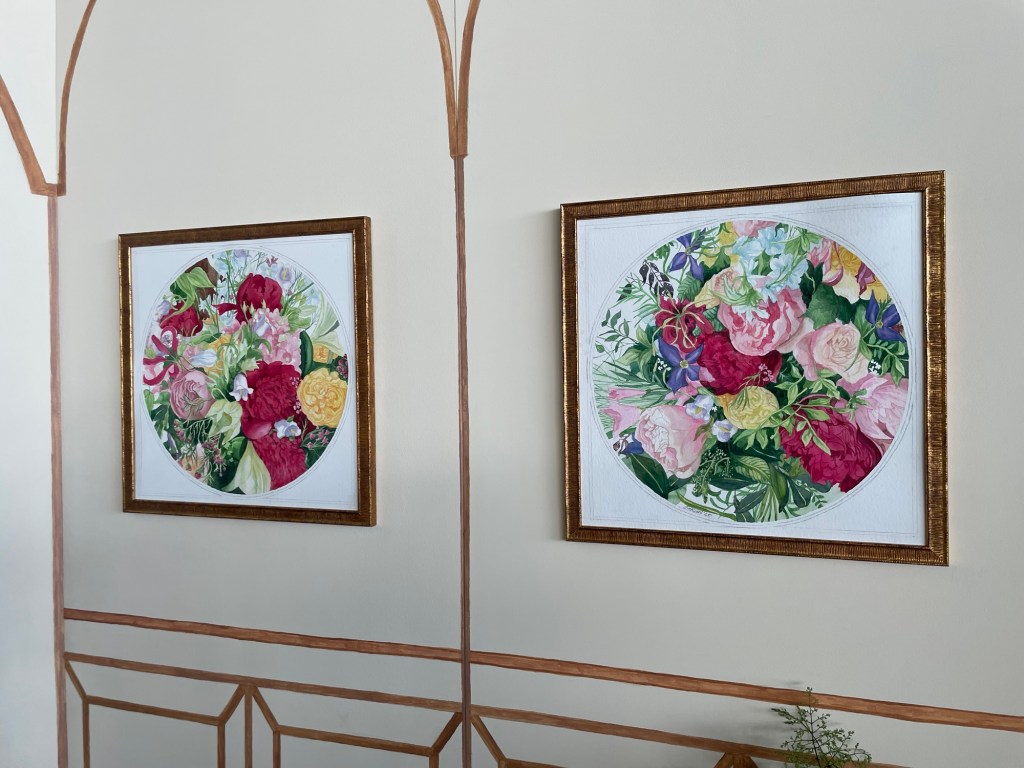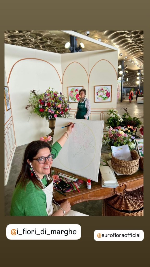 A floral arrangement in an eco-sustainable style, featuring fresh, seasonal flowers grown mostly in Italy. Fixed in water with reusable support materials, without anytype of florist foam.A theatrical backdrop copying a winter garden, serving as a setting for watercolor paintings that replicate the flowers in the composition. The artist paints them live during the exhibition.